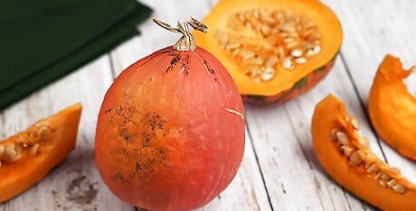 Get small pie or sugar pumpkins. You can make pumpkin puree out of any type of pumpkin, but for the most concentrated flavor (and the best for making pie), go for the smaller pumpkins that are intended to be used in recipes, rather than choose jack-o-lantern sized squash. Each pumpkin will yield a cup or so of puree. Look for pumpkins with bright orange flesh, no big bruises or gouges, and a relatively uniform shape. Heirloom pumpkins often have striated colors like yellow and green in addition to orange. These make great puree, too, but the color may not be the classic bright orange you're used to. Avoid decorative baby pumpkins - these don't contain enough meat to make much pumpkin puree, and they aren't grown to be eaten.