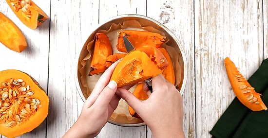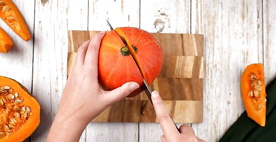 Cut the pumpkins. Start by chopping off the stems, leaving as much of the body intact as possible. Next slice the pumpkins in half, revealing their seeds.