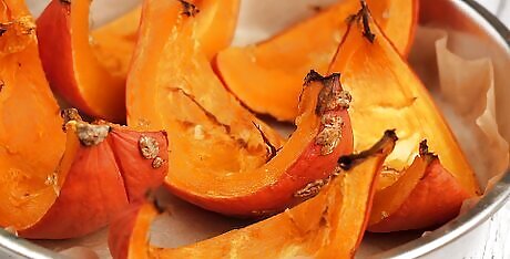 Roast the wedges. Place the baking sheet in the oven and let the wedges bake for about 40 minutes. When the wedges are finished, you should be able to easily slide a fork through the flesh. Remove them from the oven and let them cool. Don't roast the wedges until they turn brown; this affects the flavor of the puree. They should be roasted until they're just cooked through. Pour some water into the baking tray with the wedges to prevent them from overcooking. The water will create steam as it heats up, helping the pumpkin cook evenly without browning.