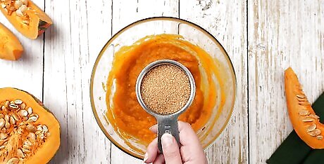 Puree the pumpkin flesh. Place it in a food processor and pulse it until it's completely smooth. Check to make sure there are no remaining lumps. If you don't have a food processor, you can use a blender or a potato masher instead. If the pumpkin puree seems too dry, add a few spoonfuls of water to moisten it. If the pumpkin puree seems too wet, strain it through cheesecloth before storing.