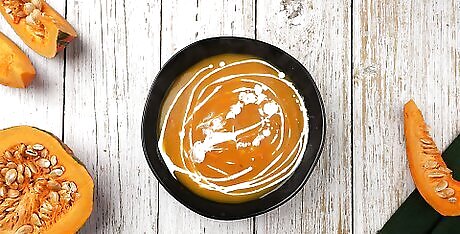 Make pumpkin soup. How about a savory use for pureed pumpkin? Making soup is a great choice for a quick weeknight dinner. Simply sauté a chopped onion and some garlic in a pat of butter in a large stockpot. Add 2 cups of pumpkin puree and stir until heated through. Add 2 cups of chicken or vegetable stock and bring the soup to a boil, then reduce to a simmer. Sprinkle in salt, pepper, and nutmeg to taste. Top with a swirl of sour cream.