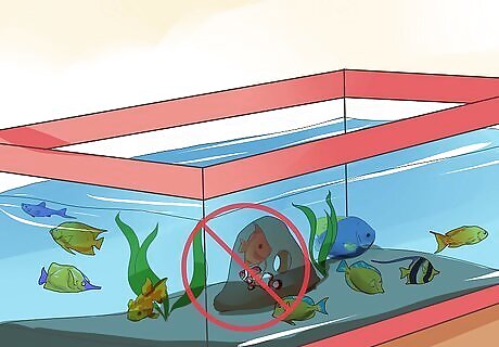Put substrate and hiding places on the bottom of the aquarium. Gravel is a good, standard substrate to place on the bottom of your aquarium, though certain species might do best with sand. Tank decorations are also important for providing distraction for your fish, preventing conflict, and keeping your tank water well-maintained. Decorations are important to the health of your fish. Because most of your fish are naturally prey, if they do not have places to hide, they will be stressed. Aggressive fish, on the other hand, will be more likely to fight without clearly delineated territory. Decorations, therefore, are important to keeping your fish healthy and encouraging them to be active. Somewhere from 50-75% cover will be good for most fish. Fish will typically appreciate cover of any type, but some do have preferences. Fish from slow moving or static water will typically prefer soft, flexible cover like plants. Fish from the ocean or fast moving rivers tend to prefer large, hard objects. Place larger decorations toward the back and side of the tank. That way, the center of the tank won’t be obscured from your sight. These decorations can also be used to cover up things like wires and other accessories that make the tank look less appealing. Only use aquarium-safe decorations in your tank.