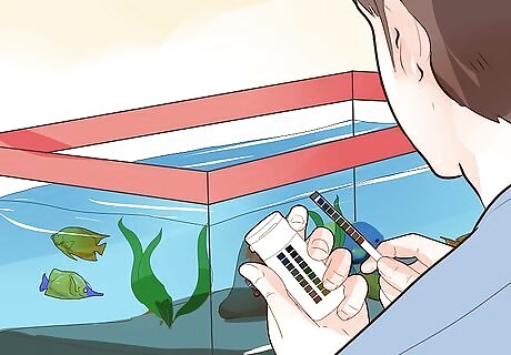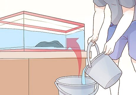 Cycle water. Once every couple of weeks, you should remove and replace 25% of the water. Do not remove fish when changing the water. This will cause unnecessary stress. Treat new water before adding it to the tank. Use a siphon to slowly introduce the new water back into the tank. When replacing the water, put new water into a bucket that is not used for any other household tasks (cleaning products will introduce dangerous chemicals). Use this bucket as a space to test and treat the water as discussed previously. After it is treated, introduce the water into the tank.
