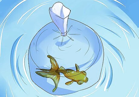 Allow new fish to acclimate to the tank. You do not want to keep your fish in the bag provided by the pet store for more than a couple of hours, because it will rapidly accumulate waste and become unhealthy. However, if you have the time to spare, place the bag in the water for about 15 minutes to allow the fish to acclimate to the temperature of the tank. Afterward, dump out about 20% of the water in the bag, replace it with tank water, and leave the bag in the tank for another 15 minutes. Then gently put the fish in the tank. For more sensitive fish, you can repeat this process, replacing the water a couple of times, until the bag is predominately tank water. This will allow your fish to become accustomed to the temperature and chemical composition of the tank. Do not transfer any of the water from the bag into the aquarium. The water is dirty and will be unhealthy for your fish.