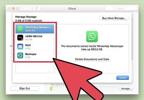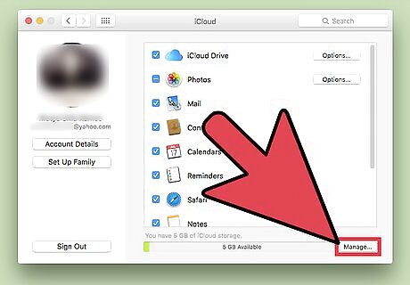 Click on Manage. It's in the lower-right corner of the dialog box. The amount of iCloud memory that you have available for storage and the total amount included in your plan will be listed at the top of the dialog box. For example, "26.5 GB of 50 GB."
