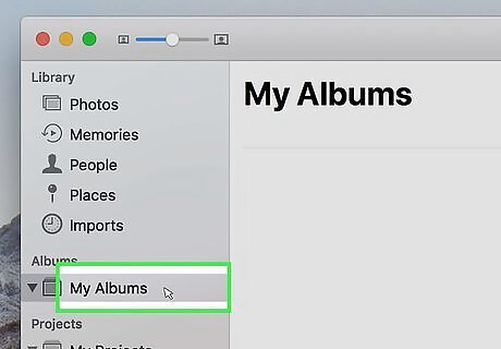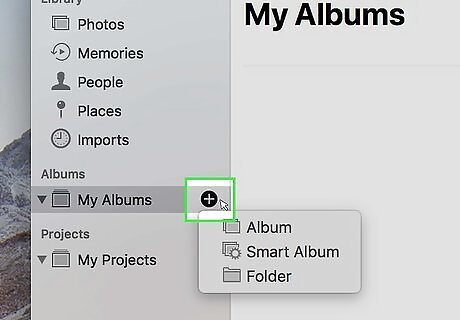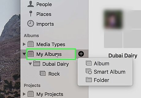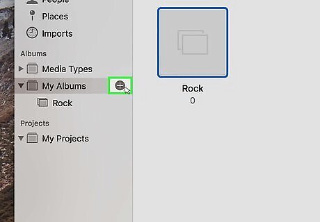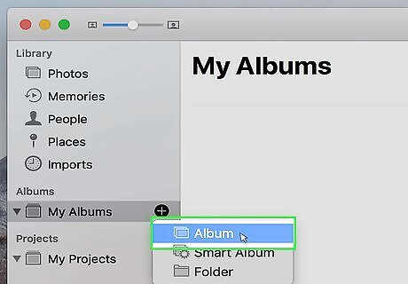 Click Album. It's the first option in the drop-down menu. This creates a new album that should appear instantly. If you don't see the new album that is created, click the triangular arrow ⏵next to "My Albums" to expand a list of all your photo albums. You can also click File in the menu bar at the top of the screen and select New Album to create a new album..