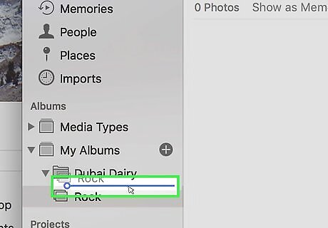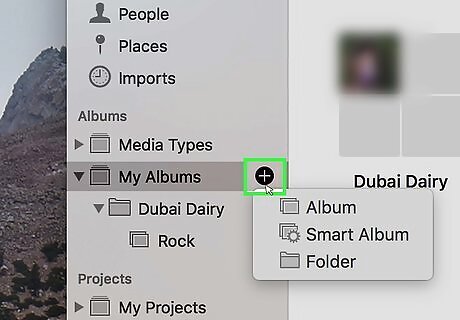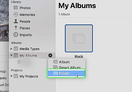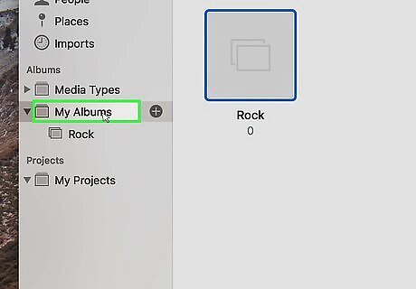 Drag albums into the folder. If you have lots of albums, you can organize them by grouping them into folders. For example, if you have lots of albums of family gatherings, you could group all those albums into a folder called "Family". If you don't see the albums on the left-side column, click the triangular arrow ⏵next to "My Albums" to expand a list of all your photo albums. You can then drag them into your newly created folder.