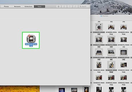 Drag the selected photos into the album you created. After you select all the photos you want to add to an album, click and hold on one of the photos and drag it to the album in the sidebar you just created, in the left-side column. You'll see a green circular icon with a plus sign "+" in it appear when your mouse is over the album. Then you can release the mouse button to drop the photos into the album.