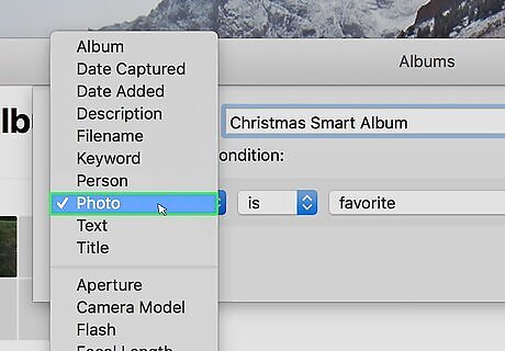 Select the first condition option. Click the first drop-down menu on the left and select a condition such as title, text, person, date, keyword, album, lens type, camera model, and more. Think of these conditions like rules for your album, any photos or videos that meet these rules will be added to the album automatically. For example, if you wanted to make a Christmas smart album and wanted to automatically include all the photos taken in December of last year, your first option in the drop-down menu could be "Date Captured".