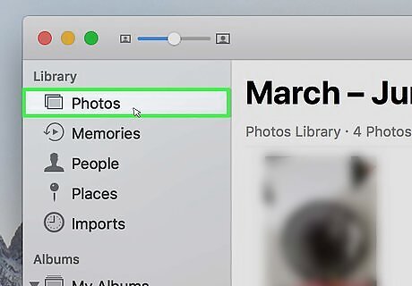 Click Photos. It's in the left-side column at the top of the "Library" section. This will display all of the photos on your computer. You can also click the Photos, Moments, Collections, or Years tabs at the top to change how your photos are grouped on the page.