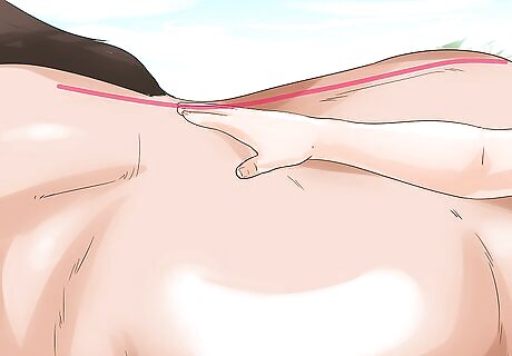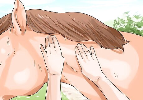 Use the effleurage technique. This is a type of gliding stroke typically used down a horse’s spine to help massage stiff and sore muscles. Make sure you stand behind the stroke so that you can use your weight to lean into the horse. Take the open palm of your hand (you can use one or both hands at a time) and stroke down the horse’s back in a gliding motion. Make sure you lighten the pressure if you go over any bony areas.