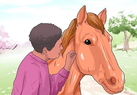 Calm yourself and your horse. This may not make sense at first but horses are very perceptive when it comes to human emotions. So a calm you equals a calm horse. If you feel agitated, wait to perform the massage at another time. Before you begin to brush your horse, gently rub under his eyes with your index and middle fingers in circular motions. This will gain trust and keep him calm.