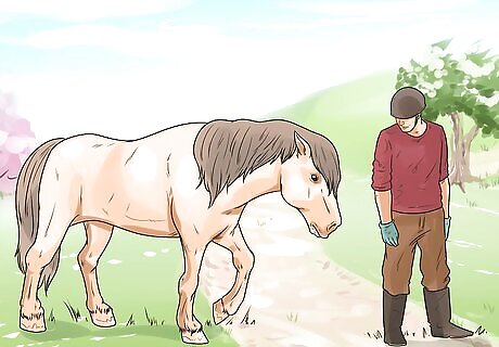 Add leg massages to your grooming routine. Use a rubber mitt to rhythmically rub the horse’s legs, one at a time, while grooming. Move the mitt in a circular motion so that you are really able to get a good massage into the muscles. Make sure you go slowly enough that the massage is effective. If you work too quickly, the end result will just be a superficial rubdown and not a massage that affects the deep tissues of the muscles. If you want to get a deeper massage into a particularly tense area, you can go back over this trouble area using your fingers instead of the rubber mitt. Watch for signs that the horse is uncomfortable (like pulling away from your touch, wide eyes, etc.) as this is probably an indication that the massage is doing its job.