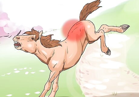 Watch for physical symptoms. There are many telltale symptoms of muscle pain in horses. These physical signs include flinching away when you attempt to saddle them, traveling with their head elevated, or trailing their hind end instead of stepping under themselves. These symptoms usually indicate that your horse has some muscle pain and would benefit from a massage.