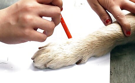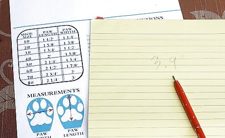 Mark the length and width of his paw on a piece of paper. One relatively simple way to measure your dog for shoes is to place his paw on a piece of paper and mark the size. Place a sheet of paper on a hard surface that your dog can stand on. You can encourage your dog to step onto the paper by feeding him a treat. Only the paw you are measuring needs to be on the paper. When a dog puts pressure on a paw, the paw will splay so ensure that he is putting weight on the paw you are measuring. If you measure a paw that is not splayed, the shoes will be too small. You can do this by gently holding the opposite paw in your hand so all the dog's weight is on the paw you are measuring. Clearly mark each side at widest point, and front and back. Don't forget to include the toenails.