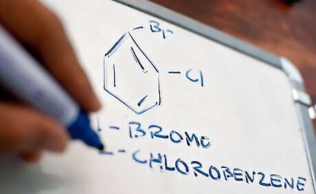 Learn benzene naming conventions. It's possible to name your benzene molecule as you would any other cyclic hydrocarbon, starting alphabetically with the first substituent and assigning numbers going around. However, there are some special designations for substituent positions on benzene molecules: Ortho, or o-: The two substituents are located at 1 and 2. Meta, or m-: The two substituents are located at 1 and 3. Para, or p-: The two substituents are located at 1 and 4.