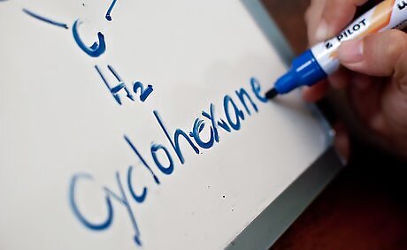Know the difference in naming a cyclic hydrocarbon. There are a few notable differences between naming cyclic and non-cyclic hydrocarbons: Because all the carbons in a cyclic hydrocarbon ring are equal, you don't need to use a number if your cyclic hydrocarbon only has one constituent. If the alkyl group attached to the cyclic hydrocarbon is larger or more complex than the ring, then the cyclic hydrocarbon may become a substituent instead of the parent chain. If two substituents are on the ring, they're numbered in alphabetical order. The first (alphabetically) substituent is 1; the next is numbered going counterclockwise or clockwise - whichever results in a lower number for the second substituent. If more than two substituents are on the ring, the first one alphabetically is said to be attached to the first carbon. The others are numbered counterclockwise or clockwise - whichever results in the lowest numbers. Like non-cyclic hydrocarbons, the final molecule is named in alphabetical order, excluding prefixes like di-, tri- and tetra-.