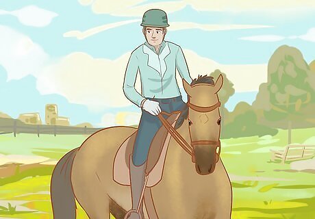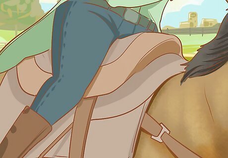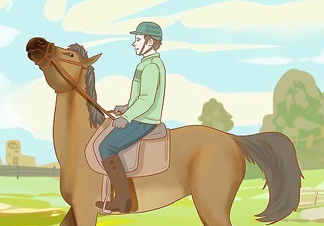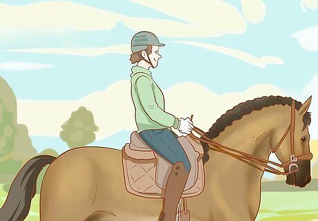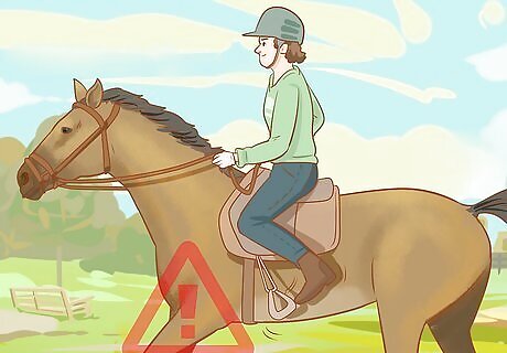 Sit up straight. You want your belly button, to be in line with the front of the saddle, and the back, so you don't put the horse off balance. If your horse takes off or goes too fast SIT BACK! Lean back and steer your horse in circles-- big at first, then smaller, and smaller, and smaller. Some people try to run their horses into fences to stop them. DON'T do that! Your horse is likely to slam on the breaks (sending you flying over his neck) or swerve (sending you over the edge). By leaning back you slow your horse gradually until he's under control. Don't turn him in too tight circles so he doesn't trip. If this doesn't work, you can half halt, or pull your hands back to your waist(not up), and slowly say in a deep tone, 'Whoa'. This can get them into a slower gait and or stop them completely in a timely manner.