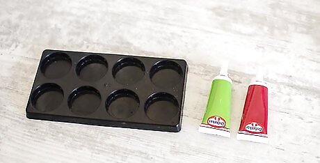 Add a small amount of each color to the palette wells. Put a single color into each well, or 2 colors if you’re mixing up your own shades. The more pigment you use, the darker and more saturated the color will look on your cake, so keep that in mind if you’re aiming for pastels. If you’re creating different shades of the same color, you may want to create them in separate wells.