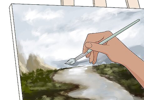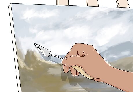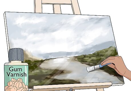 Use a gum varnish to deepen the colors on your painting. While Turner often worked with thinned oil paints to create his signature hazy effect, he would, at times, choose to coat his oil paintings in a gum varnish to deepen the hues of the colors. Gum varnish is particularly effective for deepening darker colors, which can enhance the ominous feeling of nature Turner often tried to convey in his paintings. Varnish will also help protect your painting from dust and preserve it. To apply a gum varnish to your painting, first let the paint dry completely. Then, use a paintbrush to apply a thin coat of gum varnish across the entire work. Allow the varnish to dry for at least 24 hours before handling your painting.