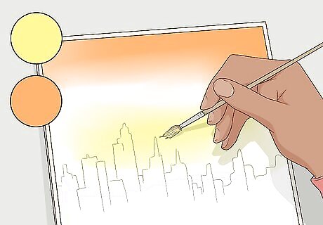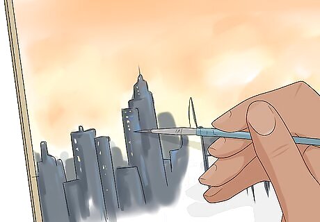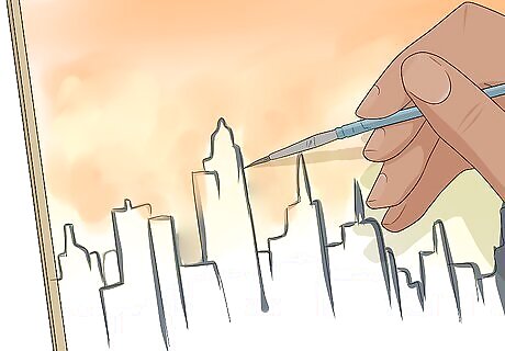 Use the point of the brush to paint your main subject with starker lines. In contrast to the blurred elements that surround and background your subject, use the very tip of your paintbrush to outline and fill in, where appropriate, the main subject of your painting. Use the pencil sketch lines to guide you as you paint. For example, if you’re painting a cityscape against a sunset background, try using the tip of your brush to apply iron and black pigments to create buildings. Focus on the outline of the buildings first, and then you can fill in the details after.