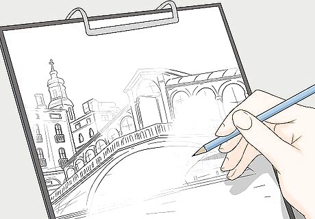 Sketch an outline of your subject with a pencil before painting. Regardless of your subject or whether you’re using watercolor or oil paints, always do a quick sketch on a piece of paper or on your canvas before using paints. Turner generally did his sketches quickly on-location or from memory, and included only basic shapes to help guide him as he painted. Turner was notorious for sketching very quickly. He didn’t worry about capturing his subject exactly as he saw it, as his paintings did not try to do this either. Therefore, just try to capture enough of your subject in your sketch so you know where to start applying your paint.