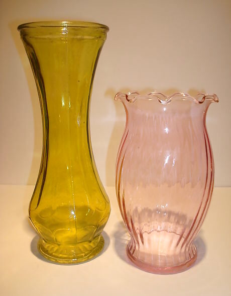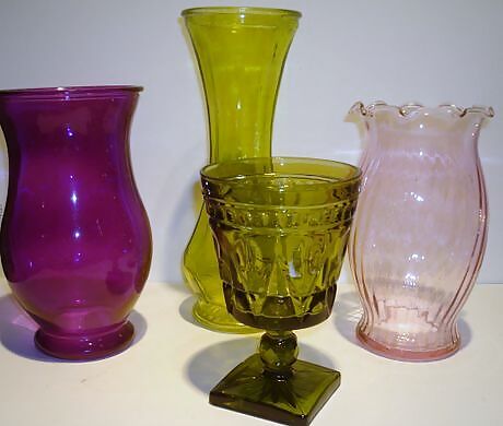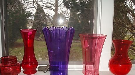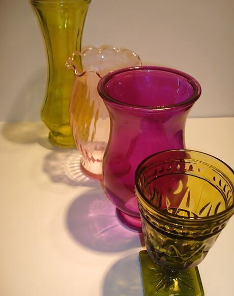 Find, at home or at the thrift shop, transparent colored glass vases, jars and drinking glasses of various shapes. Clear colored plastic can work well for this project, too.