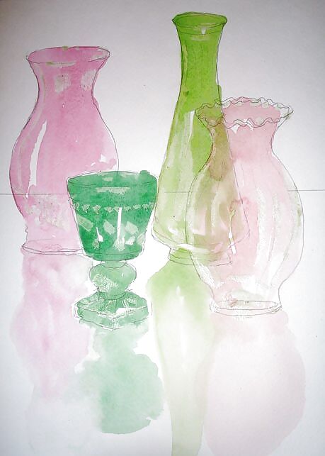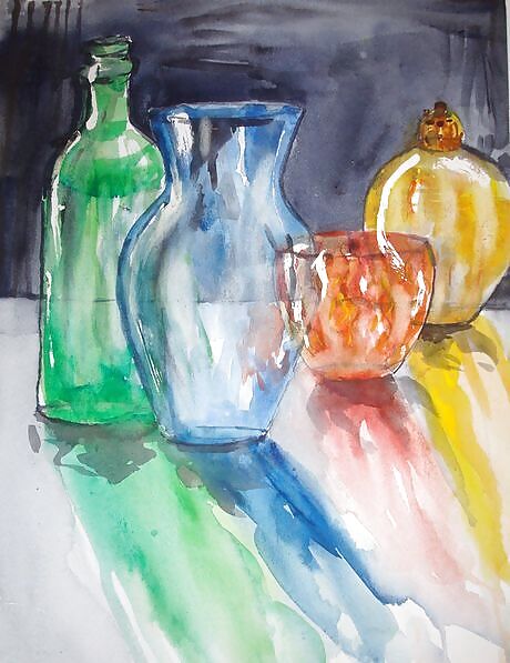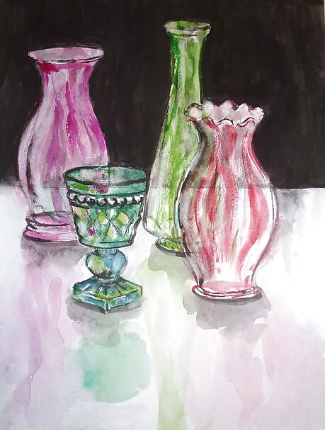 Arrange a simple still life. Use a few glass vases or jars in varying colors and shapes.