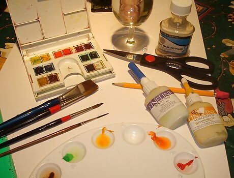 Gather other supplies. Watercolors in either tubes or pans work fine. Add an assortment of all purpose or watercolor brushes, water, a pencil, eraser, masking fluid/frisket, lined composition paper, scissors and tissues. Place all supplies on the side of your dominant hand to avoid dripping on your painting as you work.