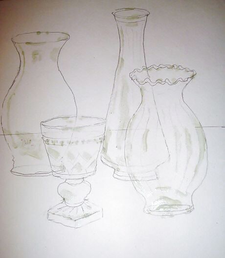 Draw around each template in pencil. Remove the templates and refine your drawing. Add thickness at the bottom and mouths of the jars, finish the ellipses at top and bottom, too. If there are swirls or decorations on the vases, draw that, as well.