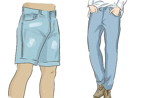 Choose straight-legged jeans, pants, and men’s shorts. Men’s and women’s pants are cut differently, so it’s important to wear only or mostly men’s pants to help you pass. A pair of black men’s work pants or khakis is a great option for building a masculine look. If you prefer jeans, buy loose-fitting men’s jeans that have straight legs. Steer clear of skinny jeans and bootcut jeans as these will show off more of your curves.Tip: Men’s pants come in all kinds of colors and prints now. You can experiment with these if it’s your style and you feel good wearing them, but opting for plain or conservative pants might help you to pass. Go with navy blue, black, grey, and khaki pants to seem more masculine.