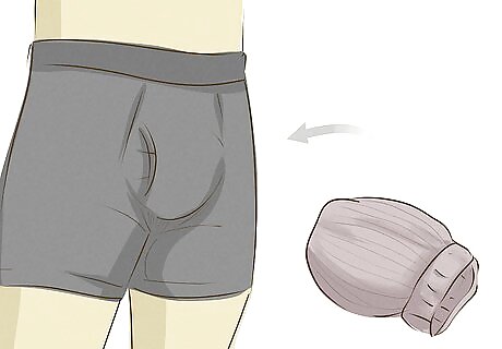 Stuff your pants in a realistic way. You can purchase a prosthetic (these are called "packers" and are available online) or create your own item using condoms, alcohol-free hair gel, and a nylon stocking. Fill a condom about halfway full with hair gel, tie it off, then insert it into a second condom to prevent leakage. Then, place the condom in a nylon stocking and tie this off so that the nylon is tight against the condoms. Most men don’t have a noticeable bulge in their pants when their penis is not erect, so keep this in mind if you stuff. You might also look into prosthetic devices for packing hard. You can buy a prosthetic penis from adult stores to wear for sex.