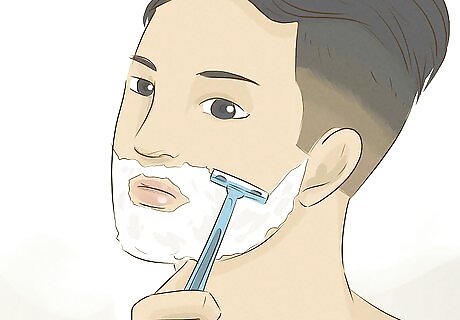 Shave your face to eliminate peach fuzz. While shaving may not seem necessary if you don’t have visible hair on your face, doing so is important because women tend to have a soft layer of peach fuzz-like hair on their faces. Men usually don't have this after puberty. They either grow long facial hair or shave regularly to remove any new growth. Since growing facial hair may not be an option for you, it’s important to shave at least every other day to get rid of the peach fuzz. Use shaving cream and a new razor every time you shave to prevent cuts. You might also consider using an aftershave to help prevent skin infections and for a masculine scent.