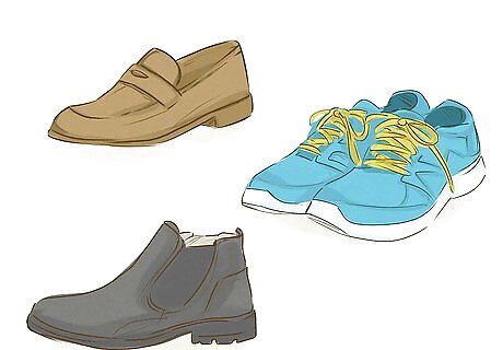 Wear men’s shoes and socks. Shop for your shoes in the men’s department and stick to masculine colors, such as grey, black, blue, brown, etc. Invest in a pair of dress shoes for special occasions and a pair of casual shoes, such as sneakers. If you have small feet, check the boys shoe department to find a pair that works for you. You can look for shoes in a shoe store, or shop for your shoes online for a wider variety of sizes, styles, and colors. Good shoes to opt for are sneakers, loafers, and boots. Women are often seen in flats, heels, and sandals, so stay away from those.
