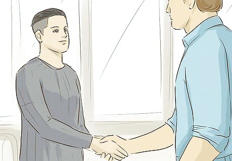 Practice giving a firm, confident handshake when you meet people. A firm handshake is an important sign of masculinity. When you shake someone’s hand, stand up or lean down so you are at their eye level. Then, look them in the eye, grip their hand firmly, and shake their hand up and down 2 to 3 times. After that, release their hand and return to a relaxed standing or seated position. Avoid holding onto their hand for more than 5 seconds. Any longer and it might get awkward.Tip: Men tend to smile less often than women as well. It’s fine to smile when you meet someone, but don’t overdo it or laugh nervously. Try to remain calm and smile in a natural, friendly way.