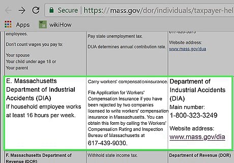 Obtain worker's compensation insurance if necessary. Many states require you to carry worker's compensation insurance for your household employees. This requirement typically kicks in if you pay them more than a threshold amount, or they work for a minimum number of hours. For example, you are required to carry worker's compensation insurance in Massachusetts if you have a household employee who works at least 16 hours a week. Contact your state's department of labor to find out if worker's compensation is required in your circumstances. Generally, you can get worker's compensation insurance from any insurance agency or broker that handles business insurance.