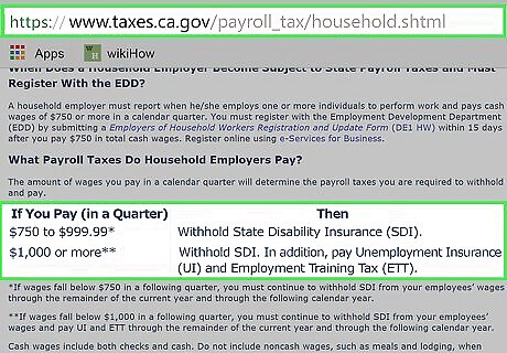Withhold state taxes as necessary. Your state may have additional taxes, such as state disability taxes, that you are required to withhold from your household employee's wages. Your state tax agency will be able to provide more information. Most states don't require you to withhold state income taxes for your household employees, but you can if you and your employee agree to do so. Otherwise, your employee will likely be on the hook for quarterly estimated taxes.