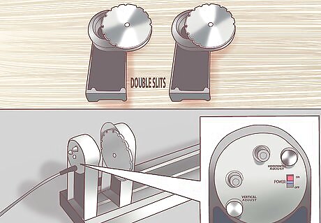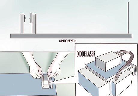 Set up the optics bench: Begin with the optics bench in front of you with the 0 centimeter (0.0 in) mark on your left. Install the diode laser at the 0 centimeter (0.0 in) mark facing towards the right. This should require little effort. Mount the multi-slit apparatus to its appropriate mount. This may require some force and will make a clicking sound when properly installed. Assembly should prove to be rather simple. Install the newly assembled multi-slit apparatus on the optics bench between the 5 and 10 cm mark. Adjustment will be made later in the experiment to both position and slit settings.