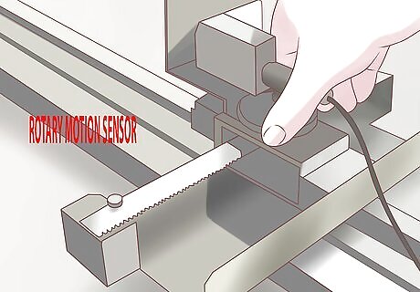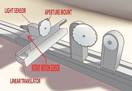 Retrieve the following materials: linear translator, light sensor & aperture mount, and rotary motion sensor. Remove one of the screws from the linear translator that secures the grooved bar and pull it out away from frame of the linear translator. Install the rotary motion sensor onto the grooved bar. This can be achieved by sliding the grooved bar into the square hole in the center of the rotary motion sensor. One important note is that the set of mounted pulleys on the rotary motion sensor should be facing upwards when installed properly. Replace the grooved bar to its original position and reinsert the screw. You should notice that one end of the connecting rod is slightly smaller in diameter and is threaded. In one hand hold the connecting rod with the threaded end up. Place the aperture mount on the rod followed by the light sensor making sure that the aperture of the light sensor is firmly against the rotating disk consisting of varying sized apertures. Simply screw in the connecting rod (Hand tighten only). Mount this newly created piece by placing the connecting rod into the last remaining hole of the rotary motion sensor, so that the light sensor apparatus is upright. Tighten the retention screw on the rotary motion sensor (Hand tighten only).