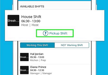 Tap the day you want to pick up. Scroll down to find the day you want to pick up a shift on, and tap on the day to select your shift. This will open a list of all the open shifts you can pick up on this day. Once you're logged in, the schedule is the first thing you see. You'll see the number of available shifts under each day on the "My Schedule" page.