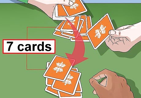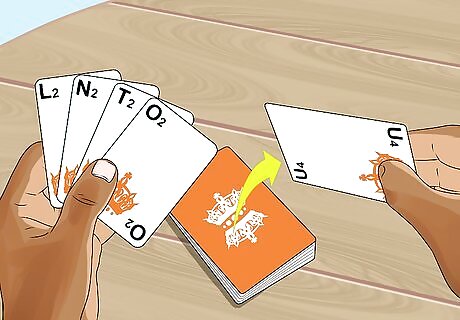 Deal out seven cards to the players at the table. There are two packs - each pack holding 53 cards. These colors include red and black, and only in large groups of three or more players should both packs be played together. The remainder of the pack must be placed at the center of the playing surface so all players can reach it. Total Cards Card letter Total cards A 5 B 1 C 1 D 2 E 6 F 1 G 2 H 1 I 4 J 1 K 1 L 2 M 1 N 3 O 4 P 1 Q 1 R 3 S 1 T 3 U 2 V 1 W 1 X 1 Y 2 Z 1