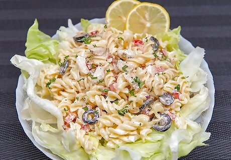 Spread lettuce on a serving platter and mound salad on top. Arrange fresh lemon slices around salad and serve remaining Ranch dressing on the side. Makes 6 generous servings.