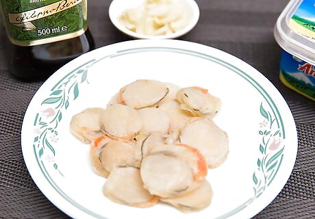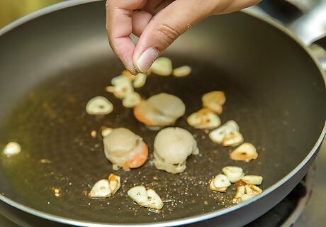 Assemble the following ingredients: 1 lb (450 g) fresh scallops 4 tbsp (60 mL) salted butter, divided 4 tbsp (60 mL) olive oil, divided 4 whole garlic cloves, divided Pinch each salt and pepper