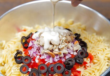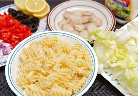 Chop scallops and mix with rotini pasta and 1/2 cup (120 mL) Ranch dressing. Stir in the chopped onions, chopped bell pepper and black olives.