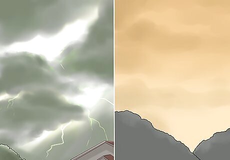 Look out for warning signs like dark orange or green skies and continuous roaring. Although warning sirens and messages are fairly reliable, they aren't perfect. Be alert during a storm and watch for the signs that a tornado may be approaching: Darkening skies, particularly if the sky appears a sickly greenish color, indicating hail, or an orange color, indicating dust being blown around by high winds. Strong, persistent rotation of the cloud base. Very calm and quiet conditions during or right after a thunderstorm. A rumble or roar that sounds like continuous thunder or, sometimes, a train or jet Whirling debris near the ground, even in the absence of a funnel cloud. Blue-green or white flashes at ground level in the distance at night – a sign of power lines being snapped by high winds.