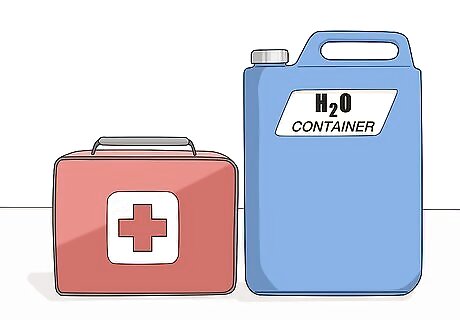 Create an emergency kit with medication and first aid supplies. Having a 72-hour supply of any essential medications as well as a first-aid kit is the first priority for your emergency kit. Also keep a radio in your kit, ideally a NOAA radio, to keep up with where the storm is and when it's safe to come out. Then, stock it with bottled water and nonperishable food. Ideally, pack enough for 3 days. Keep your kit somewhere you can easily grab it in case of emergency. Each person in your home needs 1 gallon (3.8 L) of water per day. Other things you can pack in your emergency kit include a flashlight with extra batteries, moist towelettes, and a wrench or pliers to turn off utilities. Create a pet emergency kit if you have pets. Include water, food, and any medications your pets need.