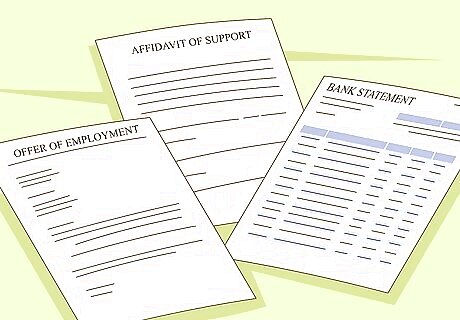 Gather evidence of financial support. You need to show the U.S. Embassy or Consulate that you can support yourself while you are in the U.S. Accordingly, you should pull together financial documents that show you have sufficient financial resources: evidence of assets, such as bank statements an offer of employment (if you are seeking a work visa) an Affidavit of Support, signed by a family member who promises to support you while in the U.S.
