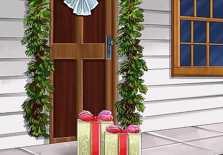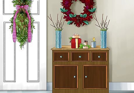 Decorate your door. The outside of your home plays a huge role in the presentation of your entryway and the first impression of your home. You can create a festive feel by decorating your door. Hang a nice wreath or line the edge of your door with garland. You could also wrap the door in holiday-themed gift wrapping paper.