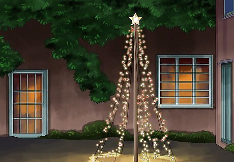 Put up outdoor holiday lights. Another way to help light the path and to give your home a festive feel is to hang holiday lights on the exterior of your home. If this is your first time hanging holiday lights, begin with a basic display. Using a hammer, place nails 6' apart along the front eave of your home. Plug lights into a power source using an extension cord, and use the nails to secure your lights.