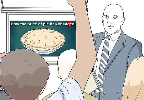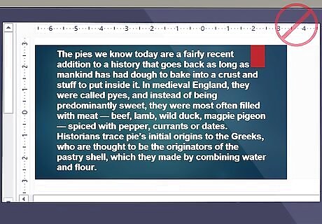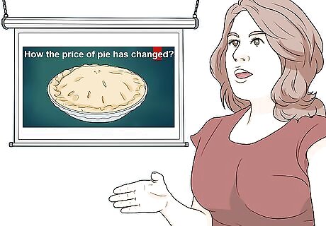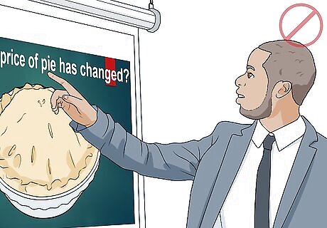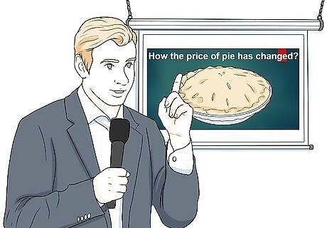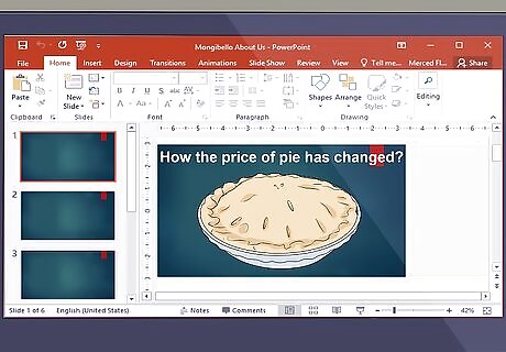 Be sure to include a few images, but don’t use too many. Include visuals on your slides when they actively contribute to and enhance the point you’re trying to make. However, they can become distracting if you crowd your slides with them, so only add images if they’re serving a purpose. For example, if you’re giving a presentation on how the price of pie has changed, you don’t need to add a stock photo of pie to the slide.